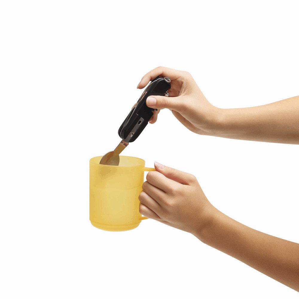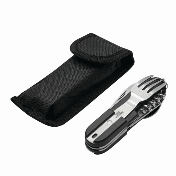 Edelstahl-Multifunktionswerkzeug WILDLIFE: mit ausklappbarem Messer, Flaschen- und Dosenöffner, Entschupper und Korkenzieher, ausziehbarer Gabel und Löffel, mit Schlüsselring, in Tasche mit integrierter Gürtelschlaufe und Klettverschluss – ideal für Camping, Picknick und Outdooraktivitäten, in Box