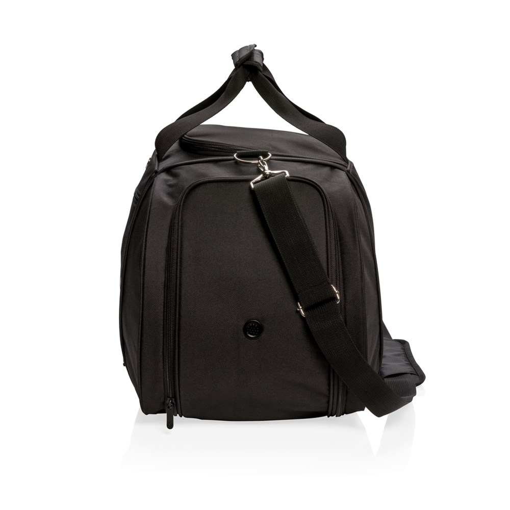 Diese 600D mit 1680D Polyester Tasche im sportlichen Design ist ideal für Ihren Besuch im Fitnessstudio oder für legeres Reisen. Inkl. geräumigem Hauptfach mit U-förmigem Reißverschluss an der Oberseite, seitlichem Schuhfach mit Belüftung und seitlichem Flaschenhalterfach. Praktisches Frontfach mit Reißverschluss für Smartphones und andere Reiseaccessoires. Verstellbarer Schulterriemen und doppelter Tragegriff an der Oberseite für besseren Tragekomfort und Trageflexibilität. PVC-frei.